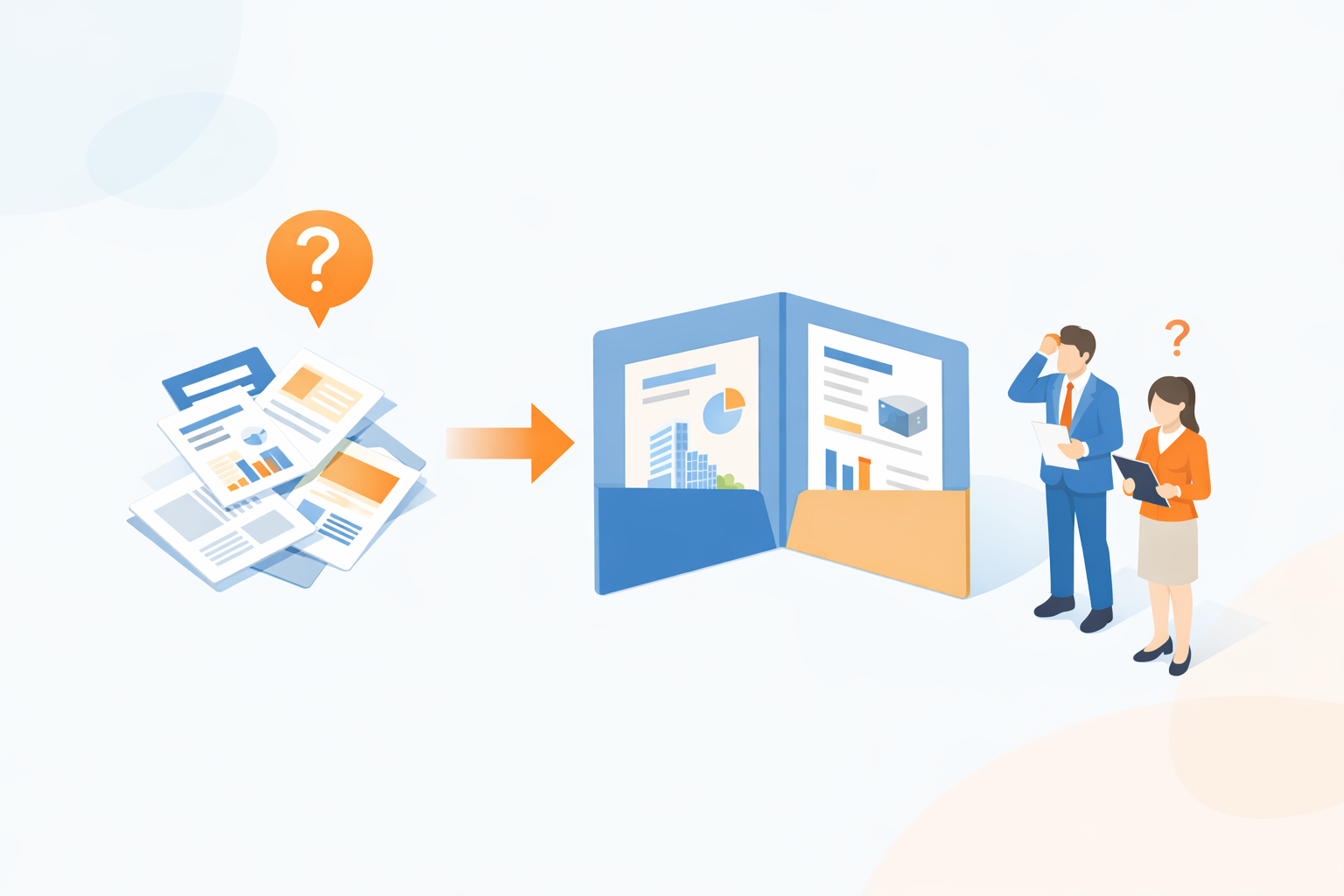 会社案内、製品チラシ、事例資料、名刺などを別々に渡すと、来場者にとっては受け取りにくく、持ち帰ったあとも見返しづらくなります。展示会では移動しながら複数ブースを回るため、資料がバラバラだと埋もれやすいのが実情です。