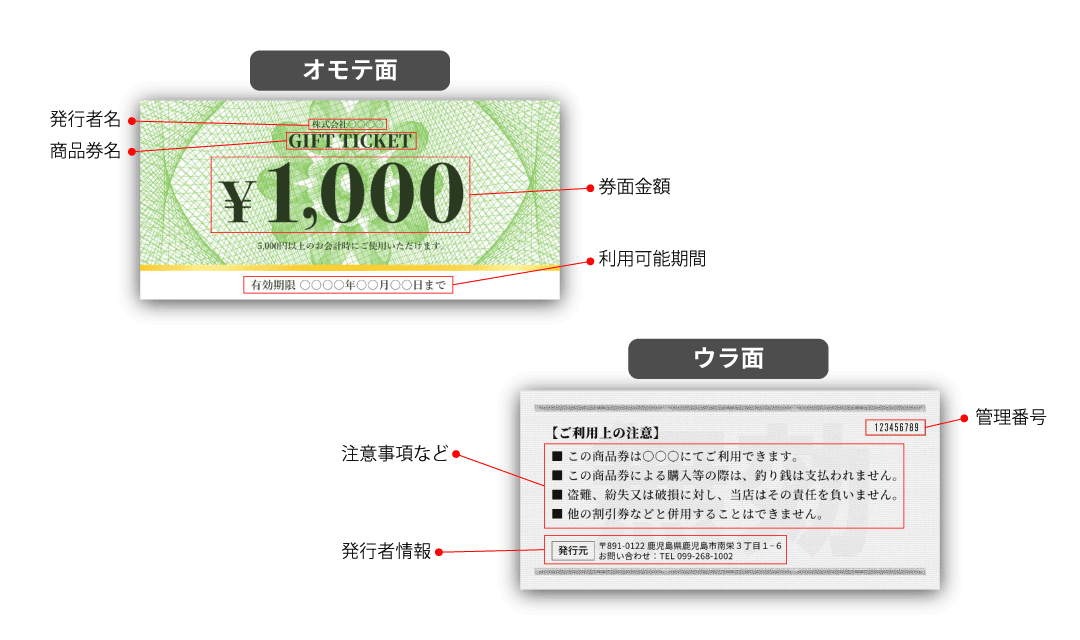 - 券面には、金額、利用期限、対象店舗、注意事項、発行者情報、券番号など、実務に必要な項目を整理して記載することが重要です。