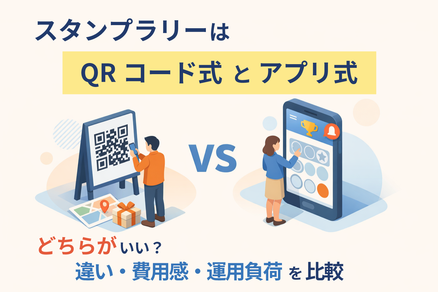 QRコード式とアプリ式のどちらがよいかは、機能の多さではなく、実施目的・参加者属性・予算・運用体制で決めるべきです。短期間で始めたい、参加ハードルを下げたい、現地掲示物を活用したい場合はQRコード式が向いており、継続利用、通知機能、分析強化、会員化、他施策との連携まで見据えるならアプリ式が向いています。